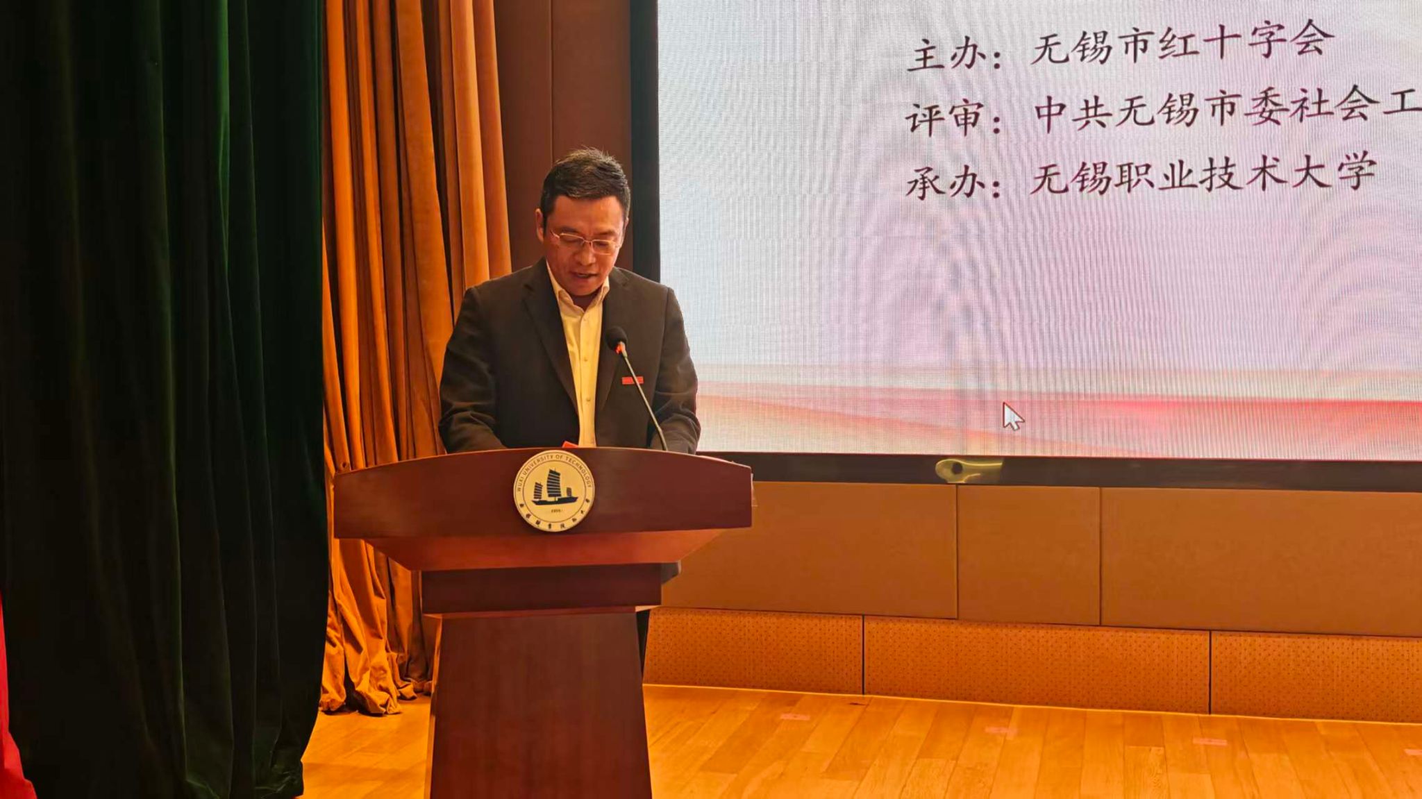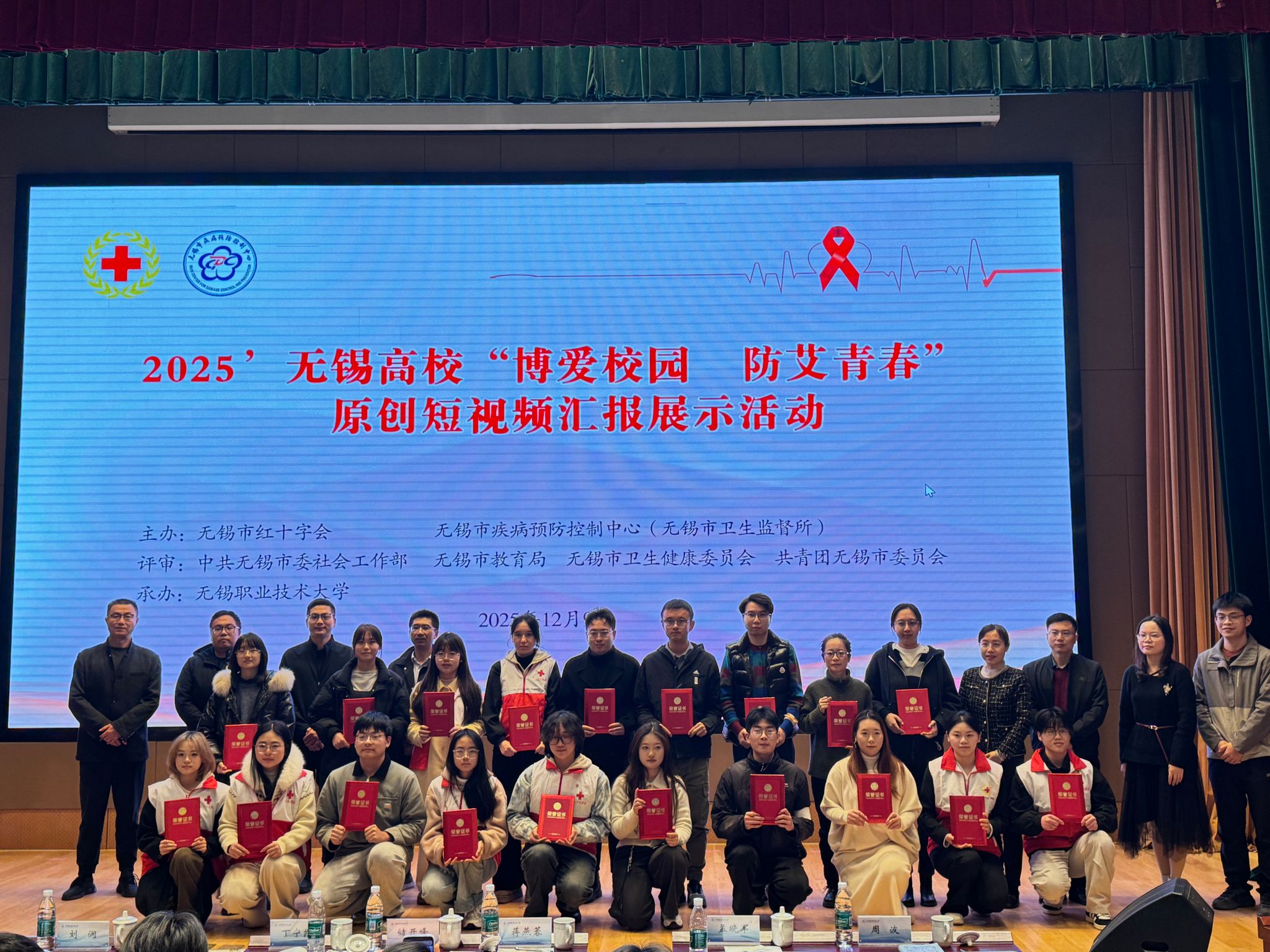 12月9日,2025年无锡市“博爱校园 防艾青春”艾滋病防治宣传项目汇报展示活动在无锡职业技术大学厚德楼一楼报告厅顺利举行。学校党委委员、副校长储开峰,市红十字会挂职副会长丁宁凯,市红十字会党组成员、秘书长蒋燕蓉,市委社工部、市教育局、市卫健委、团市委、市疾控中心(市卫生监督所)等单位负责同志出席活动。
