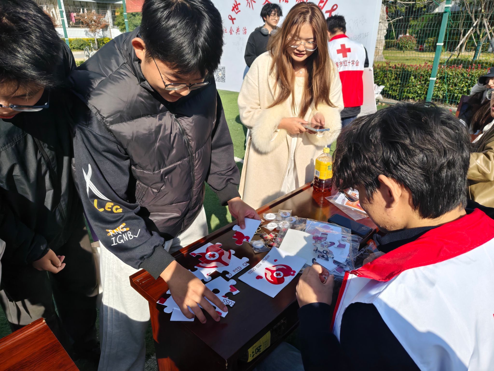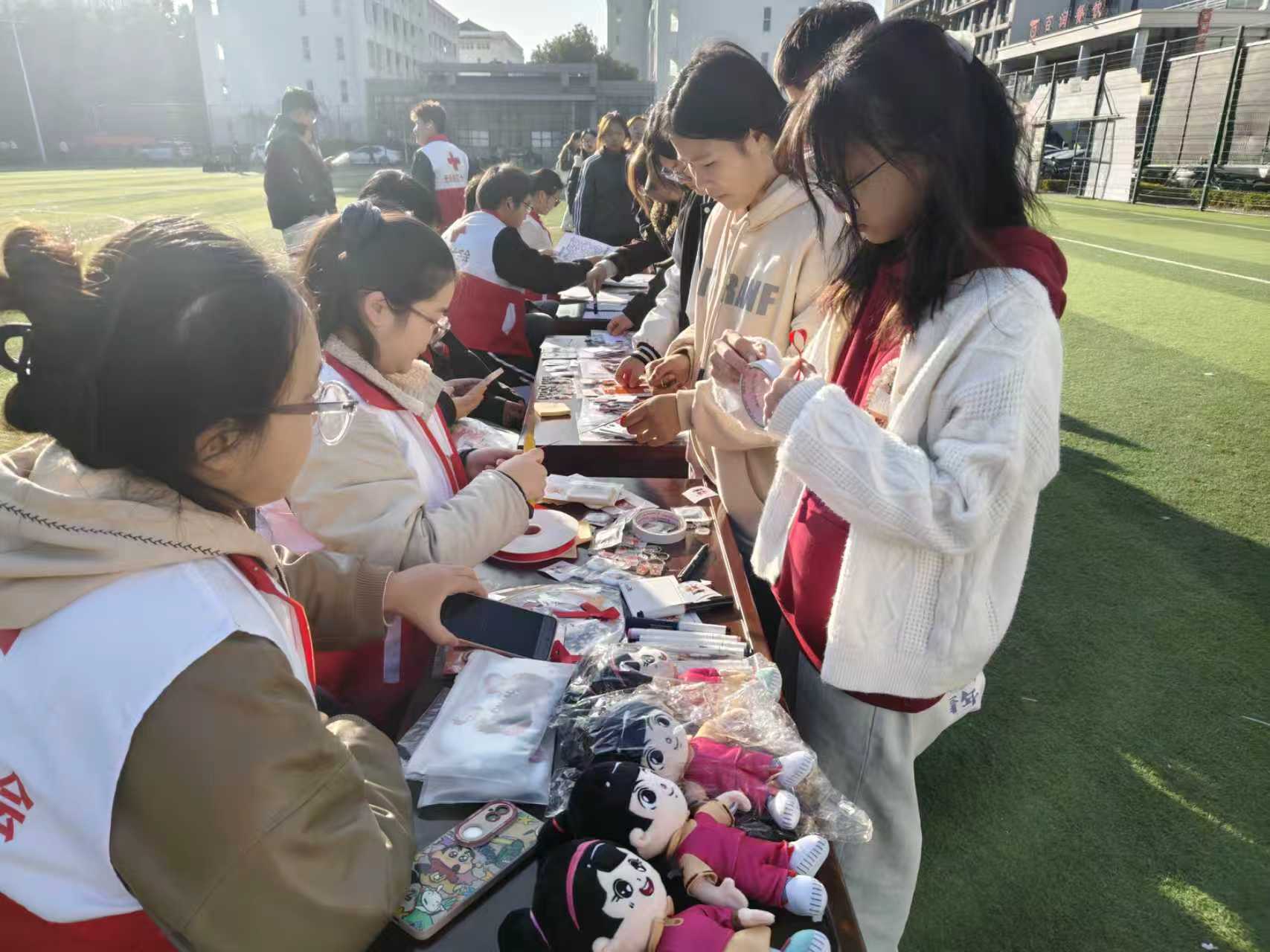 活动前期,校红十字会志愿者团队精心筹备,通过pu校园、班级宣传等渠道发布活动预告,设计制作包含艾滋病传播途径、预防措施、政策保障等内容的宣传手册与科普展板,营造了浓厚的校园防艾氛围。活动当天,主会场设置的互动体验区人头攒动,“防艾拼图”“走出迷宫”“知识问答闯关”等趣味活动将专业知识融入游戏场景,学生在轻松参与中理清认知误区。现场志愿者们耐心解答学生关于检测筛查、权益保障等疑问,发放防艾物资与宣传资料,切实将科学防艾理念传递到每一位参与者心中。手工制作区里,同学们亲手编织红丝带,将写有防艾祝福与反歧视宣言的丝带粘贴在主题展板上,用实际行动传递关爱与支持。