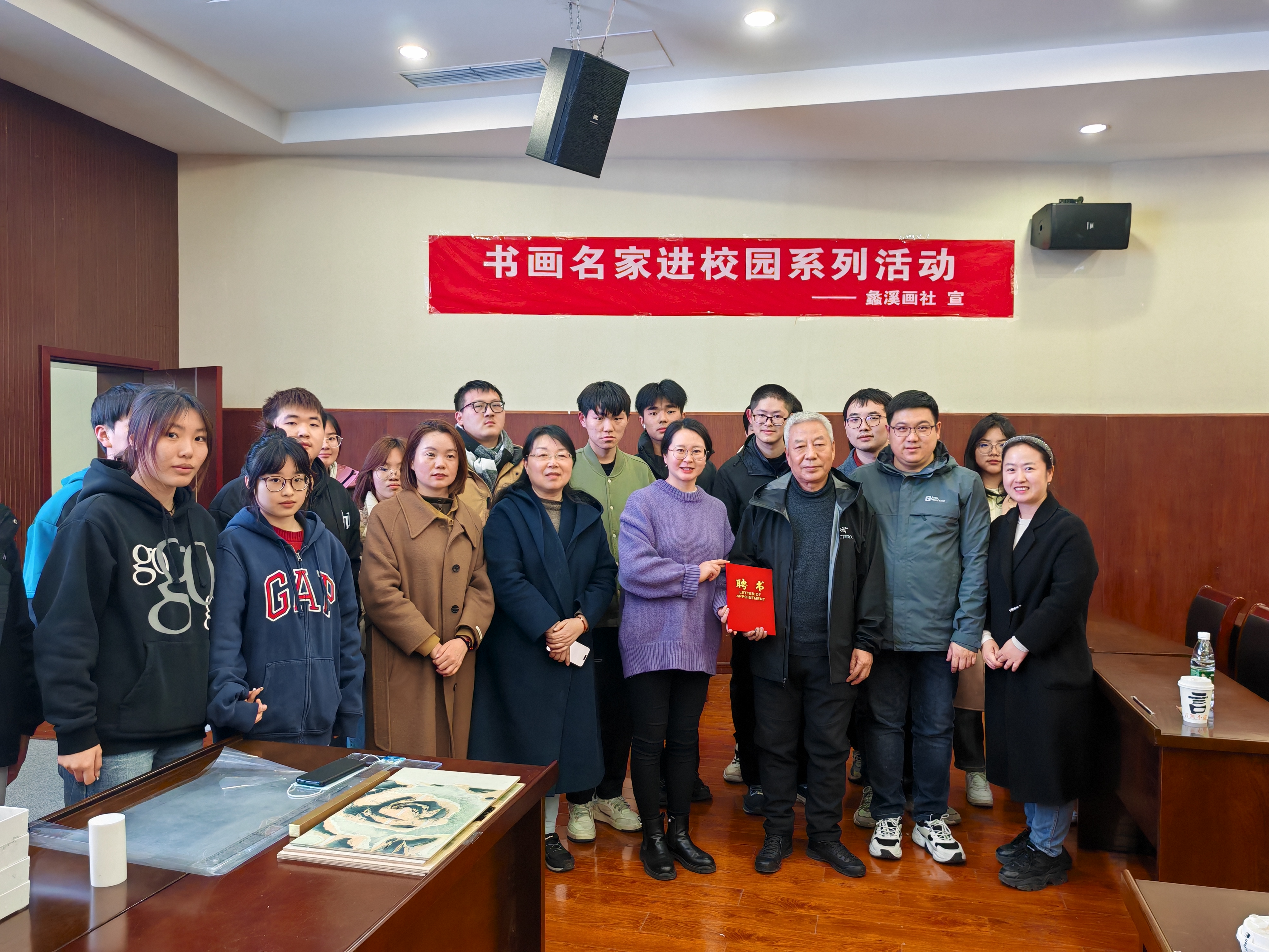 当天出席活动的还有无锡梁溪拾青版画院院长田云龙、无锡外国语小学贾芳教授、无锡少年宫书画部钱晓文主任等嘉宾。活动最后,校团委书记郑月圆为于承佑先生颁发了特聘导师聘书,并表示学校将继续举办此类艺术活动,为同学们提供更多的机会在艺术的海洋中畅游、探索和成长。