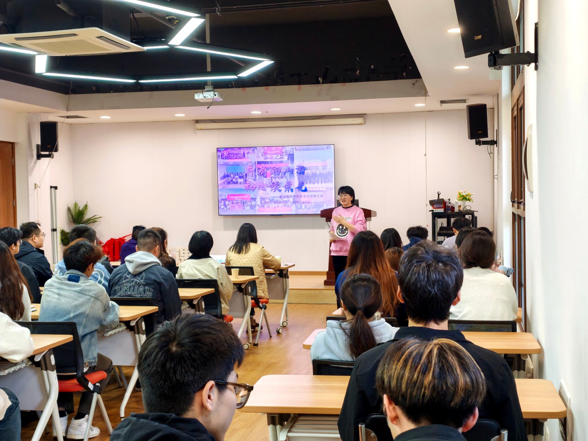 为深入贯彻落实学生会组织深化改革的要求,推动完善学生会组织述职评议制度,总结工作经验,提升工作水平,更好服务青年成长成才,校团委、校学生会于11月11日在青智库举行2025年度学生会述职评议大会。校团委书记郑月圆老师,党委学工部、学生工作处副处长张静老师,党委学工部、学生工作处学生资助管理中心主任赵欣欣老师出席会议并担任评委,各学院分团委书记和学生代表现场观摩。
