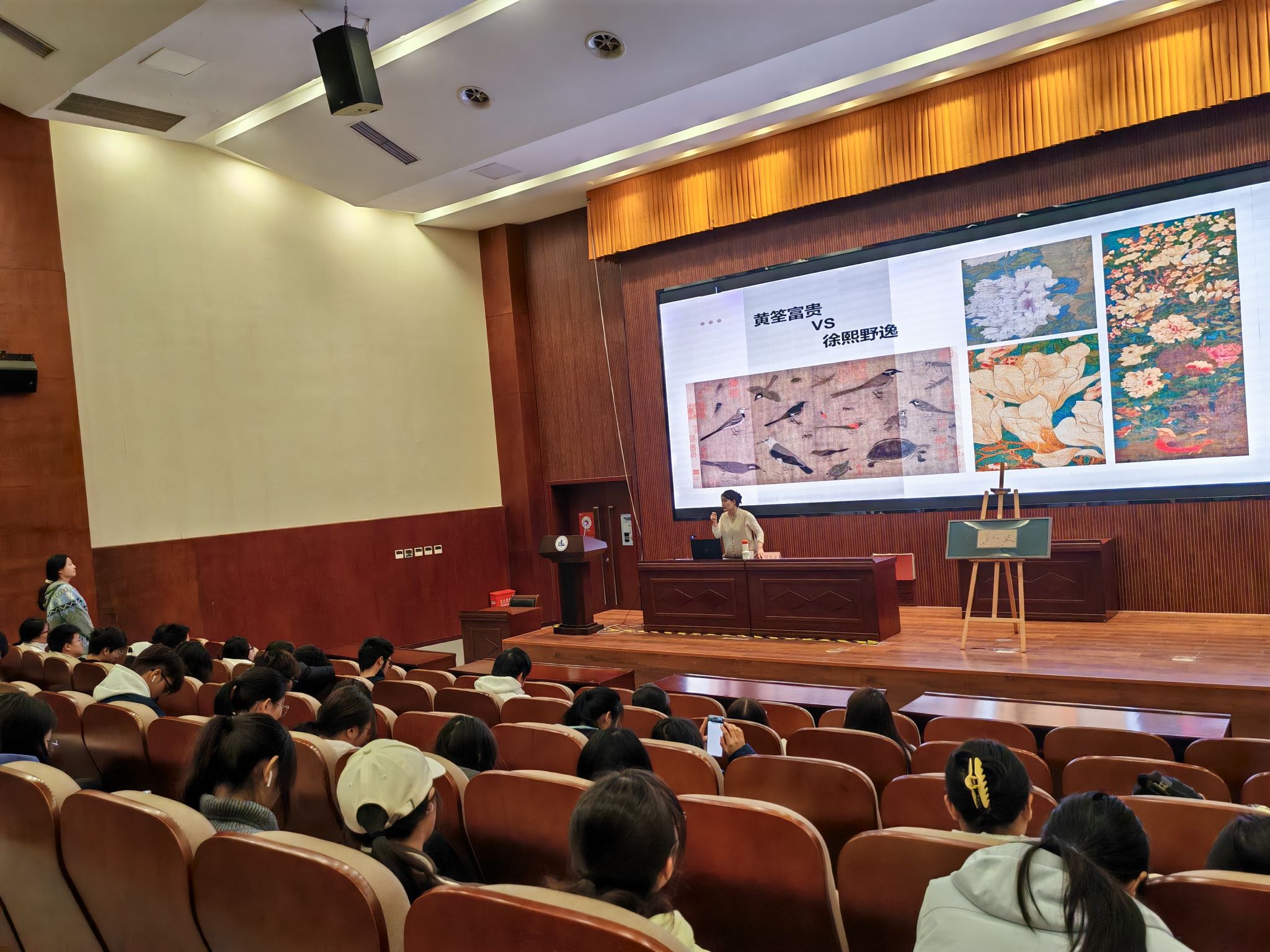 讲座伊始,她以“何谓工笔?——超越‘工整’的深邃世界”为核心,从工笔花鸟画的历史发展、创作技法、艺术内涵等维度深入解析。通过古今名作对比,清晰阐释工笔与写意的艺术分野,通过回顾工笔花鸟的“高光”时刻,分享画家工笔画“三矾九染”的匠心创作流程,让在场师生对工笔艺术有了系统且深刻的认知,也让同学们了解了各种各样的艺术展览形式。在互动环节,顾院长悉心解答了同学们关于工笔花鸟的各种问题,通俗易懂又生动有趣的讲解风格赢得了现场阵阵掌声。
