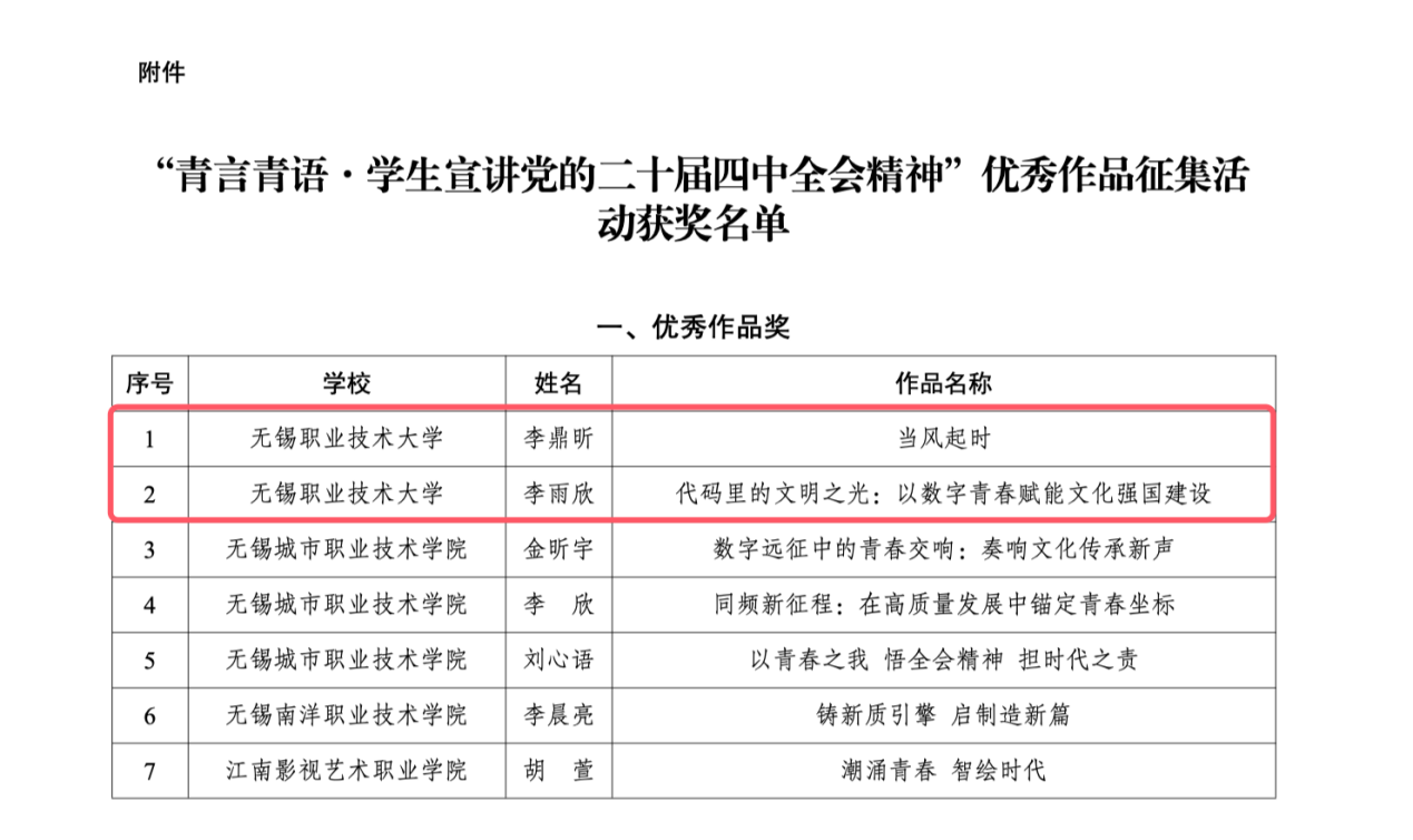 近日,由共青团无锡市委、无锡市职业院校思想政治教育联盟联合主办的“青言青语·学生宣讲党的二十届四中全会精神”优秀作品征集活动评选结果揭晓。我校青年师生在本次活动中荣获优秀作品奖2项、优秀指导教师奖2项。
