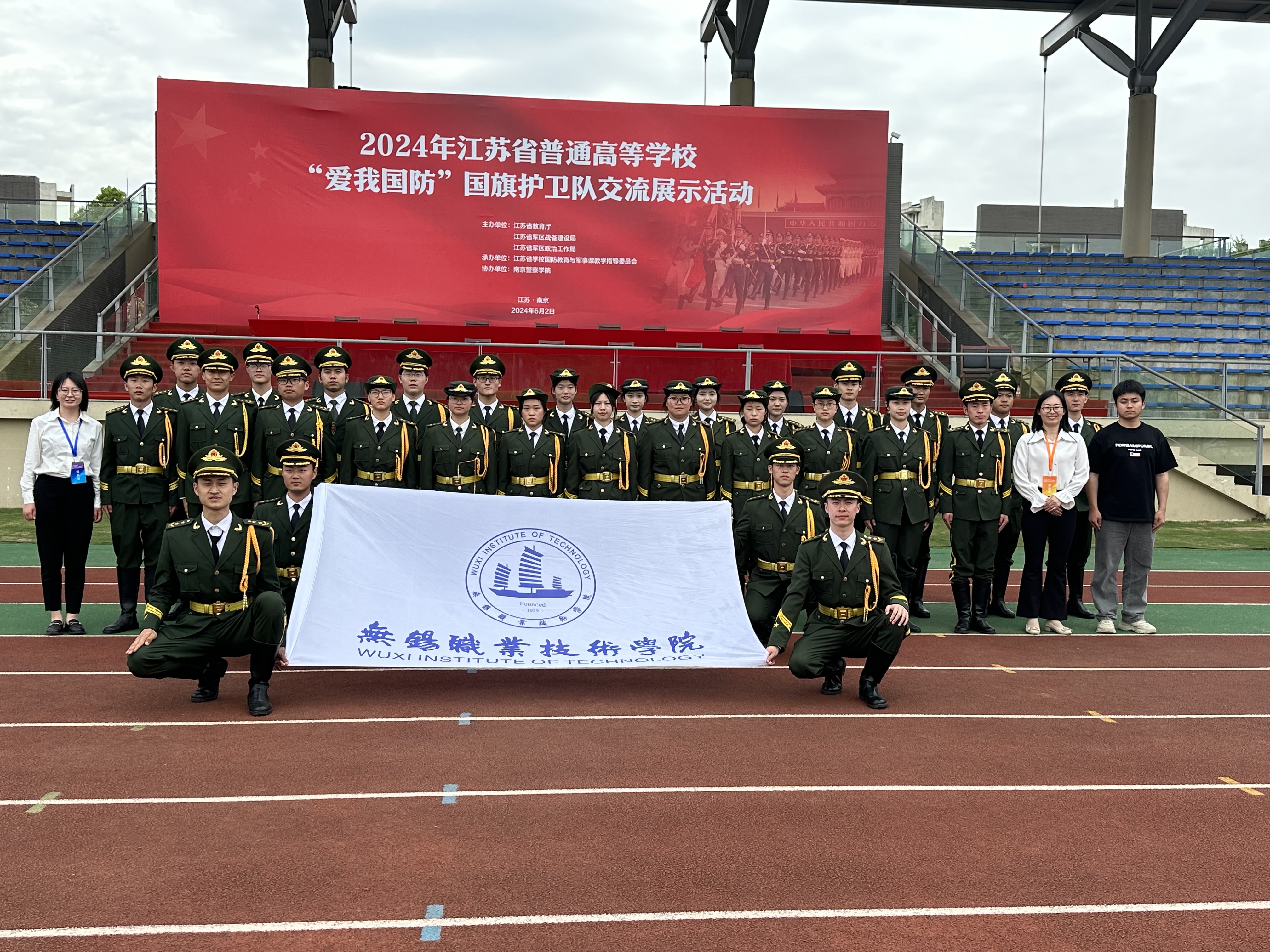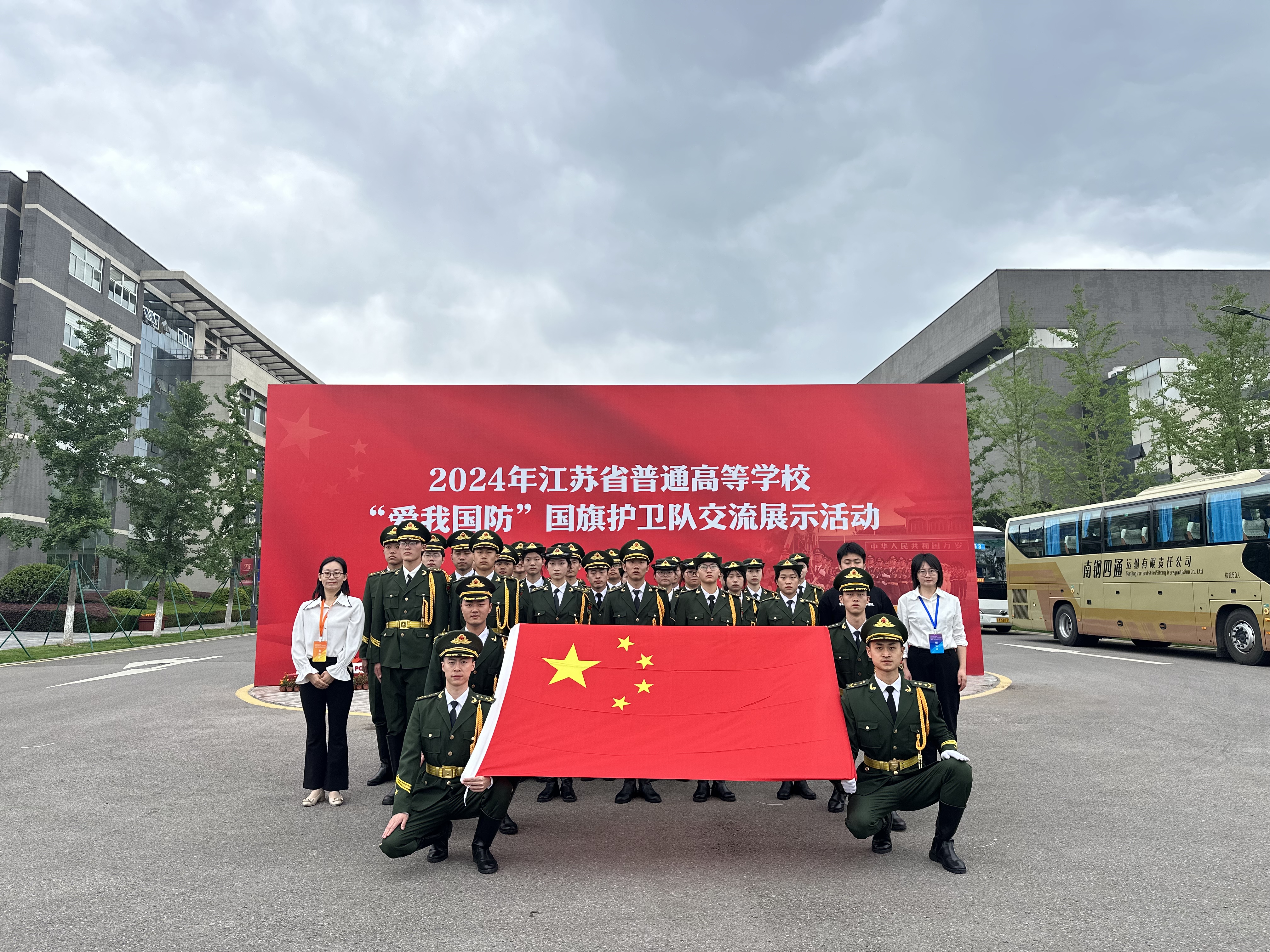 2024年江苏省普通高校“爱我国防”国旗护卫队交流展示活动由江苏省教育厅主办,江苏省学校国防教育和军事课建设指导委员会承办,南京警察学院协办。于今年4月启动,经过初赛的激烈比拼,共有20支队伍从104所高校中脱颖而出,进入交流展示环节,其中我校是10所高职院校代表队伍之一。经过为期两个月紧锣密鼓的高强度备赛训练,我校国旗护卫队在6月初的交流展示活动中,凭借昂扬向上的精神状态和整齐划一的竞技表现,获“铜牌”国旗护卫队称号。