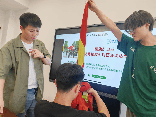 张绪文校友是我校国旗护卫队学生社团的主要创始人之一,现为湖北师范大学思想政治教育2024级硕士生。交流中,张绪文讲述了国旗护卫队初期建设的历程,回顾了在国旗护卫队度过的难忘岁月,也分享了自己从专科生、本科生到硕士研究生的奋斗历程。国旗护卫队从5人左右的初始队员,到荣获2022年无锡市“十佳社团”,再到从104所本专科高校中脱颖而出,获得2024年江苏省“爱我国防”国旗护卫队现场交流展示的难得机遇,张绪文对国旗护卫队的创建倾注了大量的心血,也对国旗护卫队的蓬勃发展赞赏有加。同时,张绪文对此次参赛队员的精神面貌、训练规范再次作了强调,并现场示范升旗仪式中的扎旗花、挥旗动作。