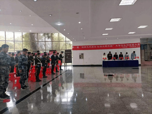 为了缅怀和致敬革命先烈,以红色基因筑牢广大学生的“中国红”信仰,用青春臂膀扛起保卫国家安全职责,清明节前夕的4月2日下午,学校首届“继承先烈遗志 发扬光荣传统”大学生队列技能大赛在教三大厅鸣锣开赛。校团委书记郑月圆、校人民武装部副部长徐锋等领导、老师和国旗护卫队全体学生80余人参加了此次比赛。