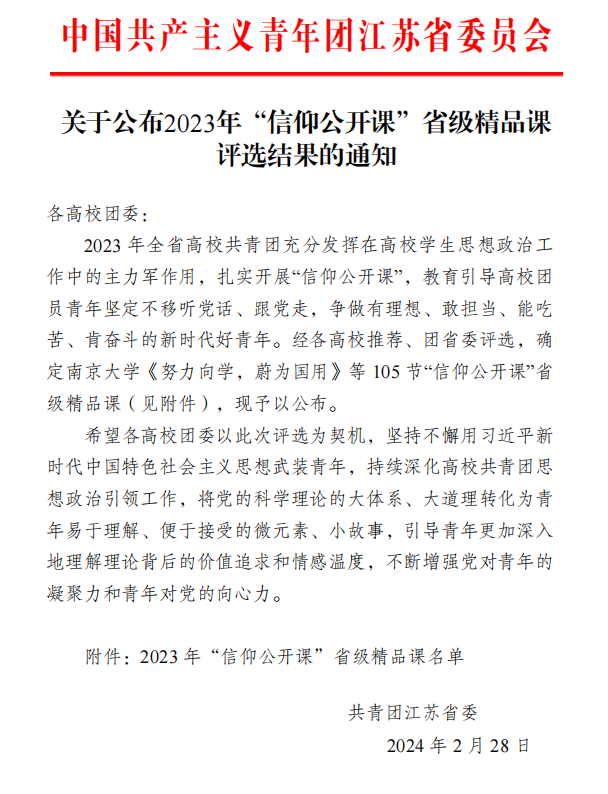近日,共青团江苏省委公布了2023年“信仰公开课”省级精品课评选结果,我校申报的《凡星,亦可闪耀——凝聚中国式现代化进程中的青年力量》获评2023年“信仰公开课”省级精品课。