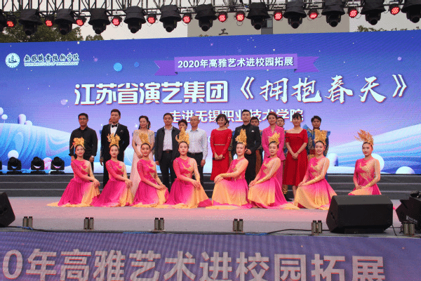 10月17日下午,由江苏省教育厅、江苏省财政厅主办的2020年高雅艺术进校园活动走进我校,本次歌舞综艺《拥抱春天》由江苏省演艺集团承演,在我校梅园篮球场举行。副校长强伟纲,校党委组织部长刘文平,校团委副书记郑月圆以及各二级学院师生共同欣赏了这场视听盛宴。
