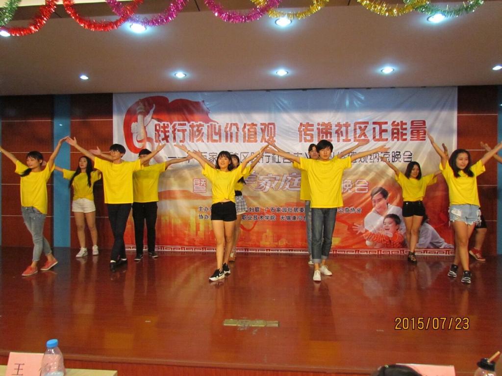 20157月,无锡职业技术学院大学生艺术团在无锡市北塘区广石家园广石亲民党群社团服务中心,参与演出践行核心价值观,传递社区正能量——广石家园社区践行社会主义核心价值观纳凉晚会”。