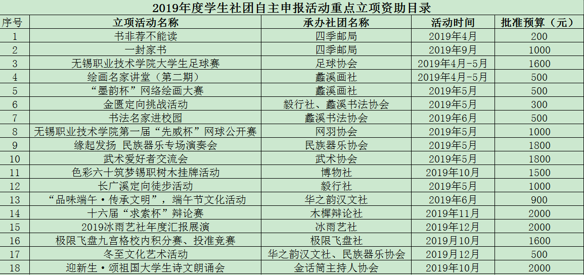 经学生社团自主申报、社团联合会初审、校团委研究审定,现将2019年批准重点立项资助的社团活动名录公布。并请有关社团根据本通知要求,做好相关工作。